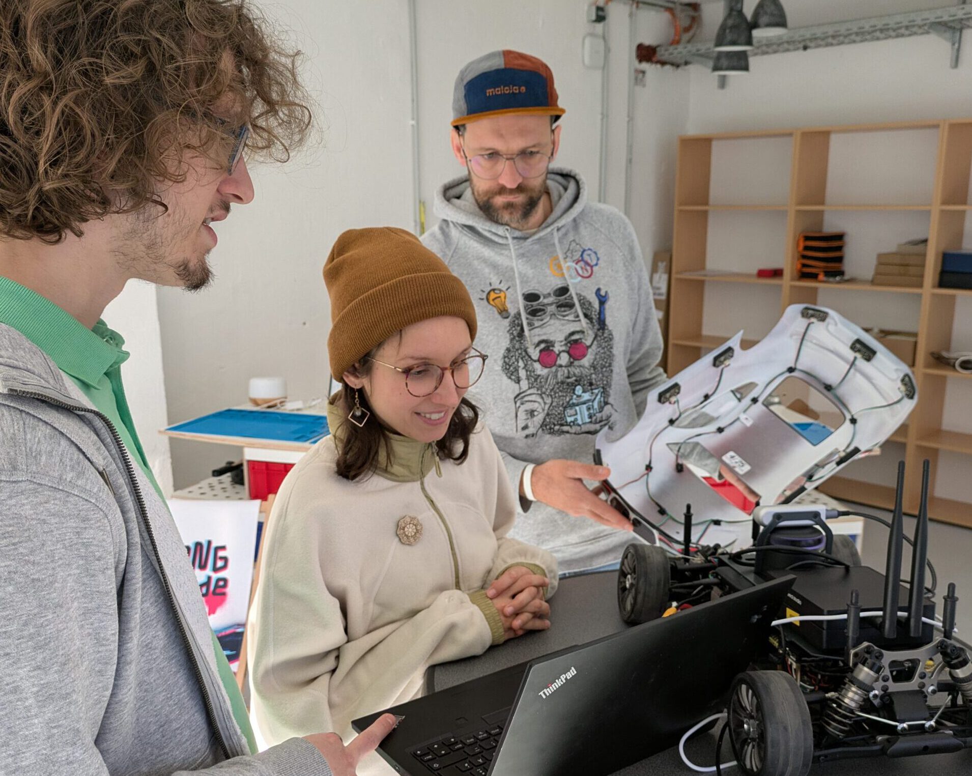 Raziel Kretschmer stellte dem Projektteam das MXcarkit vor. Als dualer Student kann er das Projekt hervorragend nutzen, um Gelerntes von der Theorie in die Praxis zu übertragen. Zum Zeitpunkt der Vorstellung waren bereits alle Sensoren und Aktoren in Betrieb genommen. Eine Fernsteuerung und Datenübertragung waren bereits möglich. Die autonome Steuerung wird Raziel als nächstes programmieren.